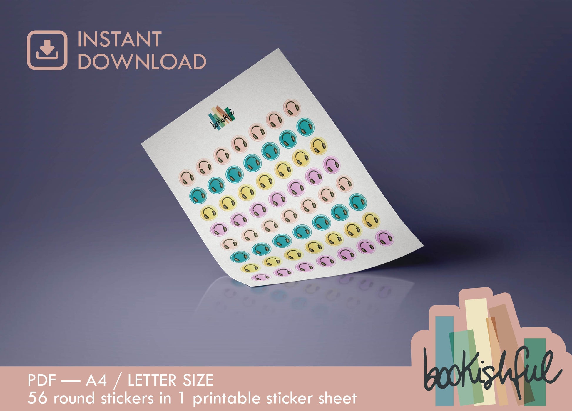Printable Icon Stickers – Headphones / Music / Meditation – Pastel Round Planner Stickers PDF – 56 Dots per Sheet – Instant Download PDF