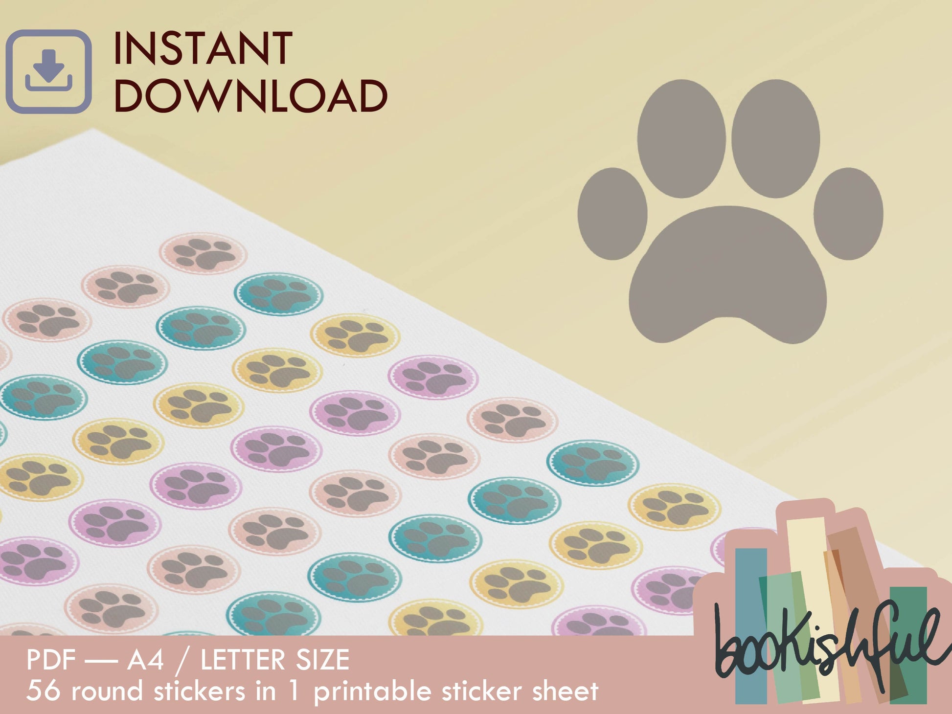 Printable Icon Stickers – Paw / Pet / Vet – Pastel Round Planner Stickers PDF – 56 Dots per Sheet – Instant Download PDF
