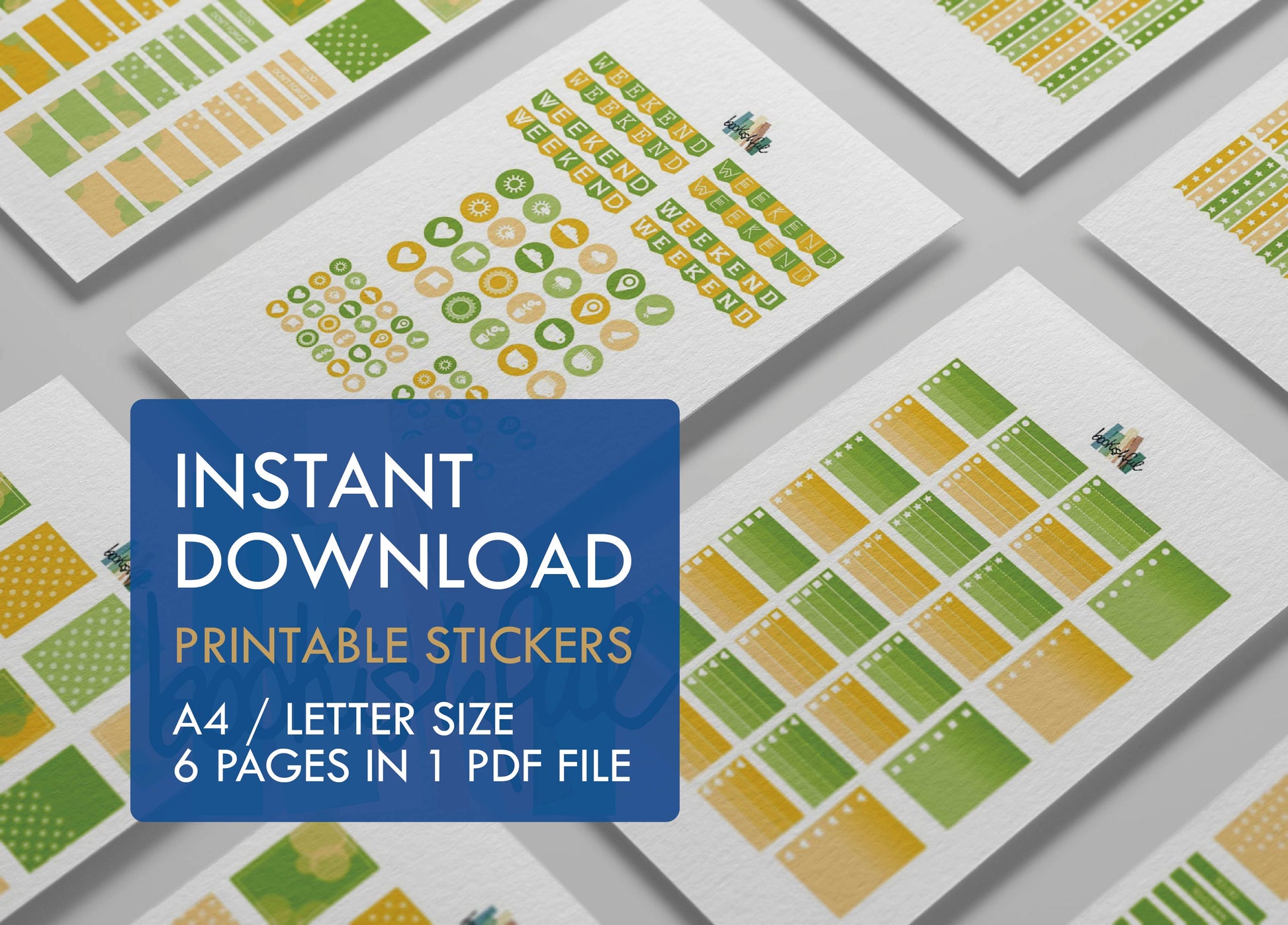 Printable Planner Sticker Kit – 300+ Yellow and Green Stickers for Journaling, Planners & Scrapbooking – 6 Pages PDF Instant Download